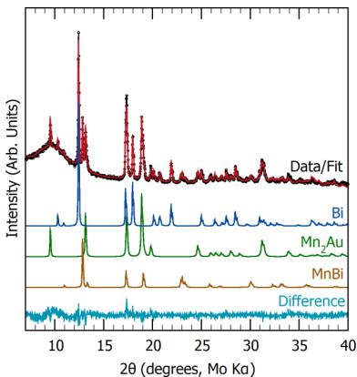 FIG. 5. Powder XRD and Rietveld-refined contribution of a typical Bi-flux growth that yields the desired \( Mn_{2}Au \) phase along with Bi and MnBi impurities. Bi and MnBi are removed prior to magnetic characterization, as described below.