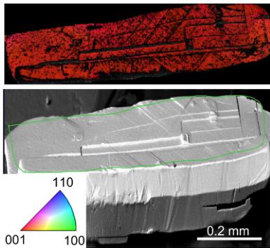 FIG. 7. Electron backscatter diffraction (EBSD) map (top) and corresponding electron micrograph (bottom) confirm that the \( Mn_{2}Au \) c axis is normal to the large flat crystal face. An inset shows the inverse pole figure key where red corresponds to the (001) lattice plane.