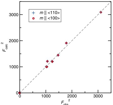 FIG. 9. Calculated versus observed structure factors for a phase of \( Mn_{2}Au \) that includes both magnetic and nuclear contributions are obtained from single-crystal neutron diffraction. Two models with Néel vectors along the \( \langle110\rangle \) and \( \langle100\rangle \) family of directions confirm in-plane moments but give equivalent fits that cannot reveal the in-plane moment direction. That direction is determined by magnetic susceptibility measurements.