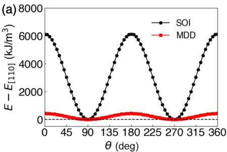 FIG. 11. Magnetocrystalline anisotropy of \( Mn_{2}Au \) from DFT calculations shows that (a) in the (110) plane, minimum energy \( (E=0) \) occurs when the spins point along \( \langle1\bar{1}0\rangle \) , which confirms that (001) is the easy plane. \( \theta \) and \( \phi \) are defined as the angles from the c axis and the a axis, respectively (see Fig. 1). (b) Magnetocrystalline anisotropy within the (001) plane shows that E is minimized near \( \phi=45^{\circ} \) , which is the \( \langle110\rangle \) direction. The two separate contributions from spin-orbit interaction (SOI) and magnetic dipole-dipole (MDD) interactions are shown in (a), while the in-plane MDD is symmetry forbidden in (b).