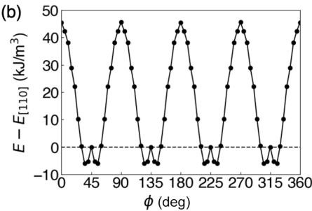 \[ \frac{E_{\mathrm{MAE}}}{V}=K_{1}\sin^{2}\theta+K_{2}\sin^{4}\theta+K_{22}\sin^{4}\theta\cos(4\phi). \quad (1) \]