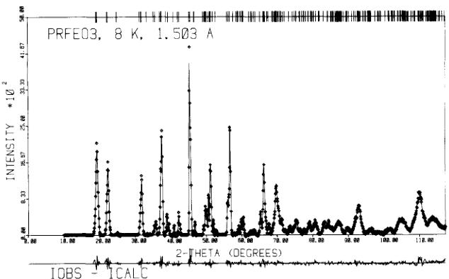 Using improved resolution (neutron wavelength, \( \lambda = 1.503 \AA \) , from a Ge 311 monochromator and collimations \( \alpha_{1} = \alpha_{3} = 10' \) ) compared with the 293 K study [4], the neutron-diffraction measurement was performed on a polycrystalline sample of \( PrFeO_{3} \) on a two-axis spectrometer situated at the Saphir reactor, Würenlingen. Figure 1 shows the corresponding 8 K diffraction pattern. The neutron intensities were analysed by the Rietveld profile method [6] using the neutron scattering lengths \( b_{Pr} = 4.45 \) , \( b_{Fe} = 9.54 \) , \( b_{O} = 5.81 \) F and the neutron magnetic form factor of \( Fe^{3+} \) [7]. Good agreement of observed and calculated neutron intensities was achieved. The relevant results are summarized in Table 1. The 8 K and room-temperature structures appear to be similar. Also at 8 K, the magnetic structure is of the \( G_{x} \) type, and the ordered magnetic moment, \( \mu_{Fe} \) , amounts to \( 4.14(4)\mu_{B} \) , i.e., it is reduced below the free-ion value of \( 5\mu_{B} \) (S = 5/2). These results support ref. 2 as well as the estimate of a weak Pr–Fe coupling in \( PrFeO_{3} \) published by Pataud and Sivardière [8], which makes reorientation phase transitions improbable.
