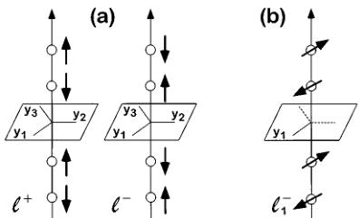 FIG. 1. Schematic of spin ordering in \( Cr_{2}O_{3} \) : In zero magnetic field the four spins in the unit cell order in two ways \( (\mathcal{S}^{+},-) \) corresponding to different \( 180^{\circ} \) domains (a). In the spin-flop phase (magnetic field \( B > 5.8~T \) for \( T < 90~K \) ) spins are oriented in the basal plane along one out of three y axes of the crystal maintaining their AFM order. This gives rise to six possible domains \( (\mathcal{S}_{1,2,3}^{+}) \) out of which one \( (\mathcal{S}_{1}^{-}) \) is shown (b).