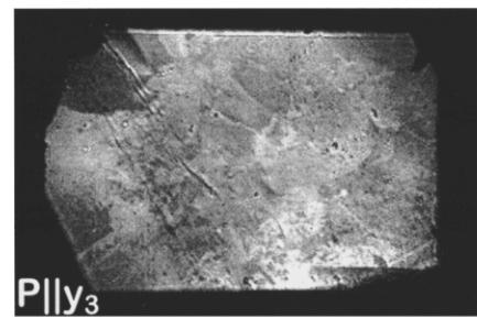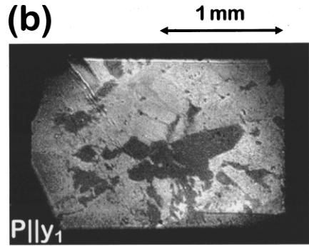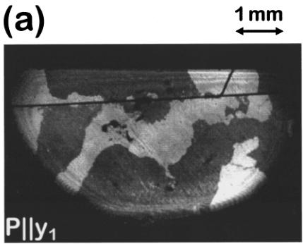 In Fig. 2(a) two of the images \( (\mathbf{P}\|\mathbf{y}_{2}, \mathbf{P}\|\mathbf{y}_{3}) \) look alike. They exhibit a weak contrast between neighboring domains whereas in the remaining image \( (\mathbf{P}\|\mathbf{y}_{1}) \) the contrast is much stronger and reversed. Thus, this sample exhibits two \( 180^{\circ} \) domains \( (\swarrow_{1}^{+} \) and \( \swarrow_{1}^{-}) \) with the AFM vector oriented along one specific twofold axis of the crystal \( (\mathcal{L}\|\mathbf{y}_{1}) \) .