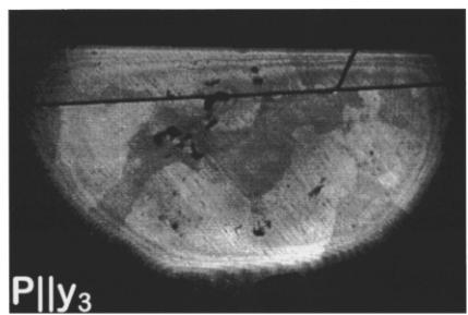 FIG. 2. Domains of two \( Cr_{2}O_{3} \) samples in the spin-flop phase. The images of sample No. 1 [Fig. 2(a)] and sample No. 2 [Fig. 2(b)] were taken with light polarized parallel to each of the three twofold axes \( y_{1,2,3} \) of the crystal. Excitation energy \( E_{SH}=2.22 \) eV, magnetic field B=6.5 T, temperature T=1.8 K, exposure time t=5 min.