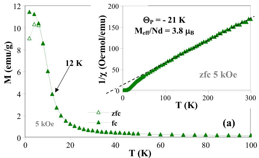small magnetic fields. The paramagnetic susceptibility of \( NdNi_{4}Si \) follows the Curie-Weiss law in the temperature range 90-300 K (inset in Fig. 1a). The fit to the Curie-Weiss law yielded a paramagnetic Weiss temperatures \( \Theta_{p} = -21(5) \) K and the effective moment per formula unit \( M_{eff} = 3.8 \mu_{B}/f.u. \) The negative \( \Theta_{p} \) can be seen as the development of antiferromagnetic-type interactions, which is also observed in the ferromagnetic \( SmNi_{4}Si \) compound [25]. The refined \( M_{eff} \) is close to the theoretical magnetic moment of \( Nd^{3+} \) (3.62 \( \mu_{B} \) ) [26], indicating Nd is trivalent in the compound. However the neutron diffraction studies do not confirm the presence of magnetic moments on Ni, and thus only Nd atoms are assumed to carry localized magnetic moments. In this case, the effective magnetic moment of the Nd atoms is 3.8 \( \mu_{B} \) , and a slight increase of \( \sim0.2 \mu_{B} \) over the theoretical value can be attributed to the polarization of conduction electrons, predominantly the Nd 5d ones, through the 4f-5d exchange interactions.