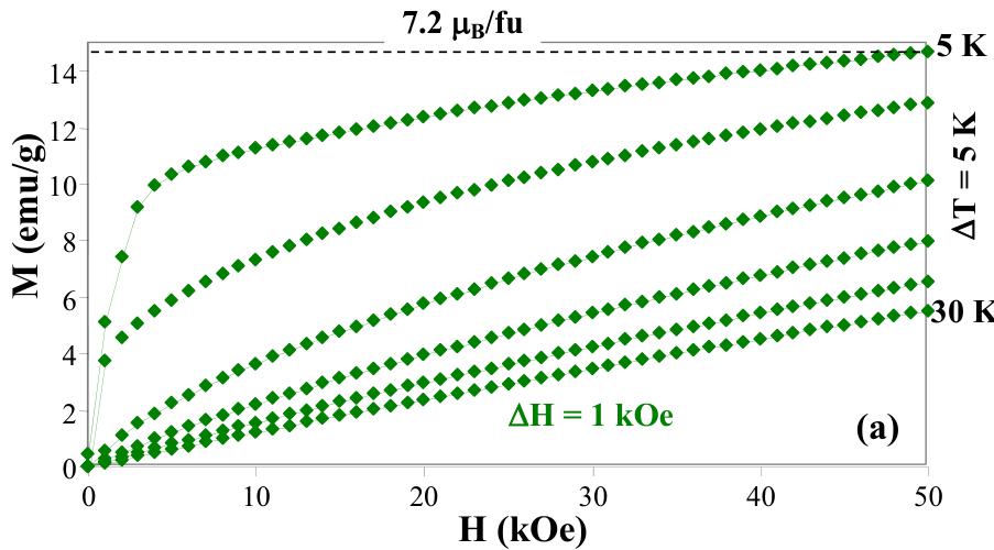 using the following formula \( \Delta S(T)_{mag} = \sum_{i} \frac{M_{i+1} - M_{i}}{T_{i+1} - T_{i}} \Delta H \) , where \( \Delta H \) is a magnetic field step and \( M_{i} \) and \( M_{i+1} \) are the values of magnetization at temperatures \( T_{i} \) and \( T_{i+1} \) , respectively [21]. The magnetic entropy change, \( \Delta S_{m} \) , for \( \Delta H = 0-50 \) kOe is plotted in Fig. 2b. As expected for a second order magnetic transition, \( \Delta S_{m} \) peaks around the Curie temperature and has a maximum value of -3.3 J/kg·K.