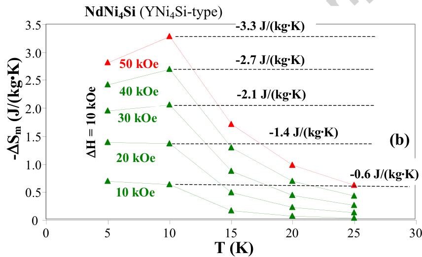 The magnetocaloric effect of \( NdNi_{4}Si \) in terms of the isothermal magnetic entropy change, \( \Delta S_{m} \) , was calculated from the saturation magnetization data (Fig. 2a). A numerical integration is performed