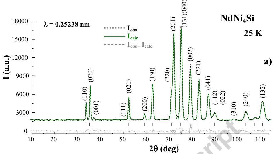 \( ^{a} \) Atomic sites of \( YNi_{4}Si \) -type \( NdNi_{4} Si \) (space group Cmmm): Nd (2a) [0, 0, 0], Ni1 (4i) [0, 0.3424(5), 0], Ni2 (4f) [1/4, 1/4, 1/2] and Si (2c) [0, 1/2, 1/2].