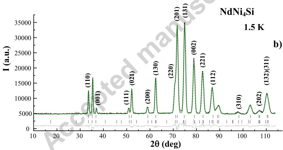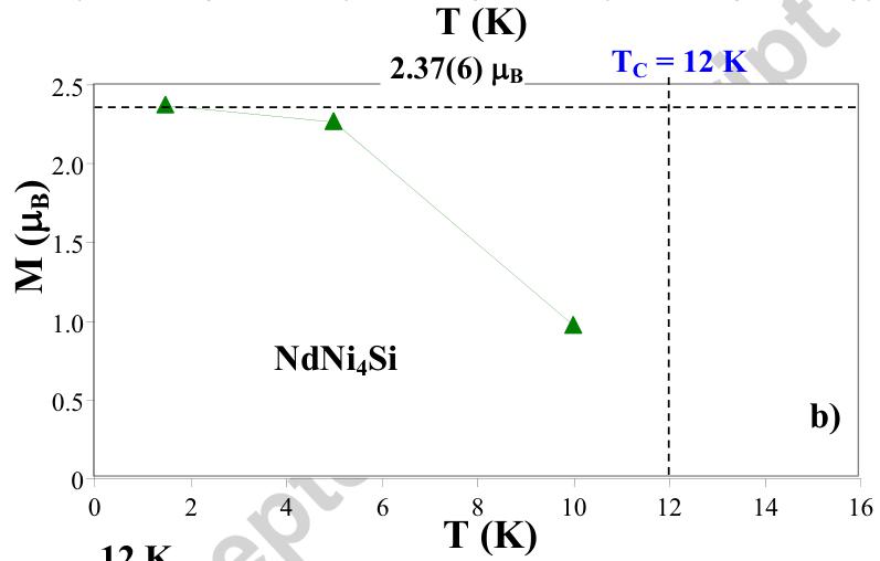 A commensurate b-axis collinear ferromagnetic model of \( NdNi_{4}Si \) fits best with the NDP data (Fig. 5). Within this model, the calculated magnetic moments for the Ni1 and Ni2 sublattices are close to or within the error bar with \( M_{Ni} \sim 0.13(15) \) \( \mu_{B} \) , which means that the significance of such ordered magnetic moment on Ni can not be confirmed. The other tested commensurate variants yielded no magnetic ordering for the Ni sublattices either. The negligible presence of the Ni magnetic moments in this compound results most probably from the Ni-3d band filling via electronic hybridization with the Nd and Ni neighbor states. The b-collinear magnetic ordering of the Nd sublattice corresponds to the Cmm'm magnetic space group as shown in Table 1. The neodymium magnetic moment reaches 2.37(5) \( \mu_{B} \) at 1.5 K, a value less than the theoretical value of 3.27 \( \mu_{B} \) expected for Nd magnetic moment [26] (Fig. 4b and Table 2), which is often observed in some rare-earth-based intermetallic compounds [27, 28].