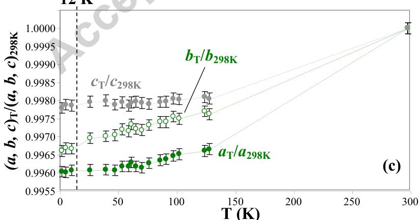 The unit cell of \( NdNi_{4}Si \) undergoes anisotropic distortion down to the ferromagnetic transition temperature: the cell parameters decrease with \( a_{T}/a_{298} < b_{T}/b_{298K} < c_{T}/c_{298K} \) , and below the ferromagnetic ordering the cell parameters remain almost constant (Fig. 4c and Table 2). As the