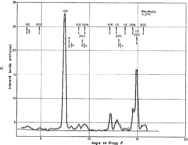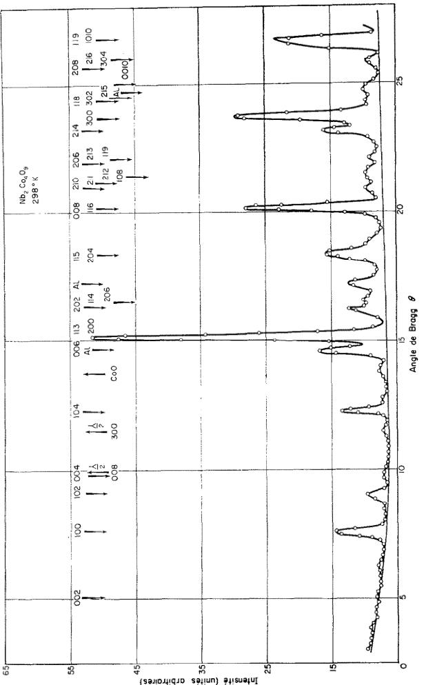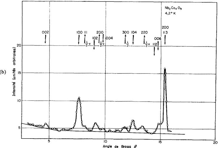 Magnetic susceptibility measurements confirmed the antiferromagnetic nature. For \( Nb_{2}Mn_{4}O_{9} \), a Néel temperature of \( T_N = 125^\circ K \) and a Curie-Weiss temperature of \( \Theta_P = -250^\circ K \) were found, with a Curie constant consistent with \( Mn^{2+} \) in a \( ^6S \) state (\( S=5/2 \)). For \( Nb_{2}Co_{4}O_{9} \), the susceptibility curve was more complex, but indicated antiferromagnetism below approximately \( 30^\circ K \). The Curie constant for \( Co^{2+} \) in the paramagnetic region suggested an orbital contribution (\( S=4/2 \)), while neutron diffraction data at 4.2K were best fitted with a spin-only value (\( S=3/2 \)), implying that the orbital moment of \( Co^{2+} \) is largely quenched at very low temperatures. A theoretical analysis using a matrix method explored possible magnetic configurations and stability conditions, confirming the observed magnetic structure and providing insights into the nature of exchange interactions.