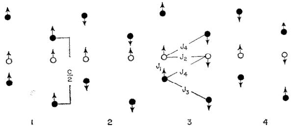Faisant \(h = k = 0\) et \(l = 1\) dans (11) on trouve quatre modes supplémentaires qui se déduisent des quatre modes précédents par un changement de signe de l'ir.teraction \(J_{3}\). Nous ne les discuterons pas davantage. C'est le cas (3) (21) qui est observé