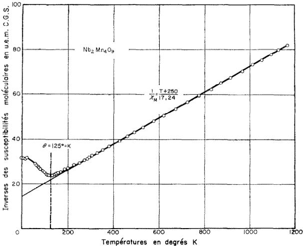 - \( Nb_{2}Mn_{4}O_{9} \): Antiferromagnetic, \( T_N = 125^\circ K \), \( \Theta_P = -250^\circ K \)