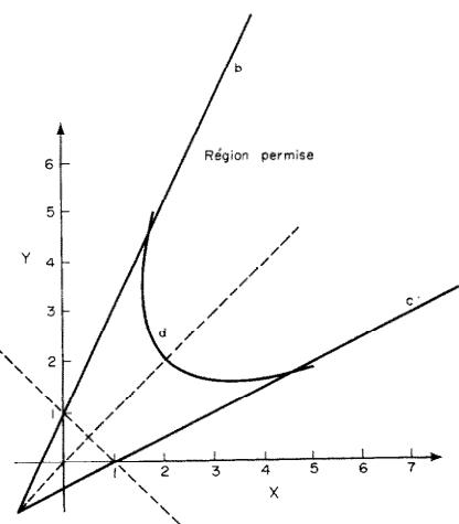 de l'hyperbole (d) (Fig. 9). On en déduit que \(x\) et \(y\) ne peuvent tomber au-dessous d'une valeur minimum de \(\frac{1}{2}(1 + \sqrt{6}) = 1,73\). En admettant \(J_2 \sim J_3\), \(x\) et \(y\) seraient au moins supérieures à \(+2\).