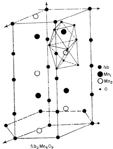 - \( Nb_{2}Mn_{4}O_{9} \): Nb (4c) z = 0.3575; M1 (4d) z = 0.0181; M11 (4d) z = 0.297; O1 (6f) x = 0.300; O11 (12g) x = 0.334, y = 0.295, z = 0.0884