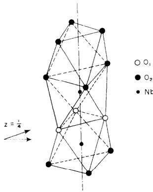 La structure de \(\mathrm{A}_2 \mathrm{M}_4 \mathrm{O}_9\) (\(\mathrm{A} = \mathrm{Nb}, \mathrm{Ta}; \mathrm{M} = \mathrm{Mn}, \mathrm{Fe}, \mathrm{Co}, \mathrm{Mg}\)) constitue un nouveau type de surstructure du corindon au même titre que les ilminités. Mais alors que dans les ilminités le rapport des cations est \(1:1\), il est ici \(1:2\). Le groupe d'espace le plus probable est \(P \bar{3} c 1\). Fait assez surprenant, les octaèdres de coordination du niobium pentavalent ont une face commune. En conséquence, la répulsion coulombienne déplace les atomes Nb voisins proches très notablement des centres de l'octaèdre.