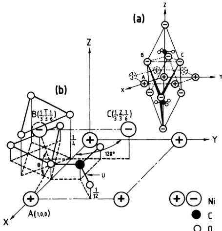 FIG. 1. (a) Trigonal structure of \( NiCO_{3} \) showing the antiferromagnetic piling up along the trigonal axis. (b) Part of the trigonal structure of \( NiCO_{3} \) in the case of \( u = \frac{1}{3} \) . The antiferromagnetic interactions are superexchange ones in the case of the pair A-B and through \( (\mathrm{CO}_{3})^{2-} \) radical in the case of the pair A-C.