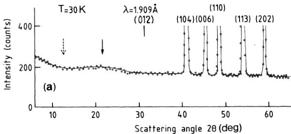 The additional reflections observed at \(T < 25\) K [Fig. 2(b)] may also be indexed with the hexagonal cell of parameters \(a_{0}\) and \(c_{0}\), the same selection rule \(-h + k + l = 3n\) being observed. In that temperature range, no detectable