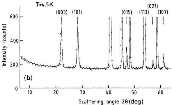 The difficulty of growing single crystals of \( NiCO_{3} \) which are not found in nature is well known. \( ^{1} \) Using hydrothermal methods, \( ^{11} \) the largest dimensions of the crystals we obtained never exceeded 0.1 mm. About 1 g of such crystals ground into a fine powder was used in the neutron-diffraction experiments. X-ray work performed at room temperature shows no impurities, all the observed reflections being found at Bragg-angle positions corresponding to the parameter values \( a_{0} \) and \( c_{0} \) ( \( a_{0}=4.609\ \AA \) , \( c_{0}=14.737\ \AA \) (Ref. 11)) of the equivalent hexagonal cell containing six \( NiCO_{3} \) units. The same conclusion is reached from the neutron-diffraction work performed down to \( T>25\ K \) [Fig. 2(a)], whereas at \( T<25\ K \) additional reflections manifest themselves which may also be indexed with the hexagonal cell of parameters \( a_{0} \) and \( c_{0} \) [Fig. 2(b)]. No preferential orientation effects are detected, measurements performed in different orientations of the sample to the counter showing no modification of the intensities of the various reflections.