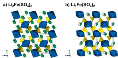 Figure 1. Comparison of the structures of (a) \( \mathrm{Li_{2}Fe(SO_{4})_{2}} \) and (b) \( \mathrm{Li_{1}Fe(SO_{4})_{2}} \) . Projections along the a-axis. \( FeO_{6} \) octahedra and \( SO_{4} \) tetrahedra are displayed in blue and yellow, respectively. The Li atoms are shown as green balls. In the delithiated phase, the lithium is on a half-occupied site as represented by the half-colored balls.