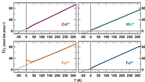 Figure 3. Evolution of the inverse of the magnetic susceptibility \( (1/\chi) \) of the title compounds as a function of the temperature. Purple, green, orange, and blue colors are assigned to \( \mathrm{Li}_{2}\mathrm{Co}^{\mathrm{II}}\left(\mathrm{SO}_{4}\right)_{2} \) , \( \mathrm{Li}_{2}\mathrm{Mn}^{\mathrm{III}}\left(\mathrm{SO}_{4}\right)_{2} \) , \( \mathrm{Li}_{1}\mathrm{Fe}^{\mathrm{III}}\left(\mathrm{SO}_{4}\right)_{2} \) , and \( \mathrm{Li}_{2}\mathrm{Fe}^{\mathrm{II}}\left(\mathrm{SO}_{4}\right)_{2} \) , respectively. Experimental curves are fitted with the ideal Curie–Weiss law in the temperature range of 200 K \( \leq T \leq 300 \) K (dashed lines).