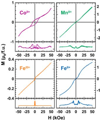 Figure 4. Magnetization curves of \( \mathrm{Li_{2}Co^{II}(SO_{4})_{2}} \) (purple), \( \mathrm{Li_{2}Mn^{II}(SO_{4})_{2}} \) (green), \( \mathrm{Li_{3}Fe^{III}(SO_{4})_{2}} \) (orange), and \( \mathrm{Li_{3}Fe^{II}(SO_{4})_{2}} \) (blue), as a function of the applied field measured at 2 K. Derivative curves are displayed in the lower part of each diagram.