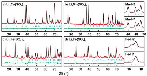 | Li4CoII(SO4)2 | Li2MnII(SO4)2 | Li3FeII(SO4)2 | Li1FeII(SO4)2 | |