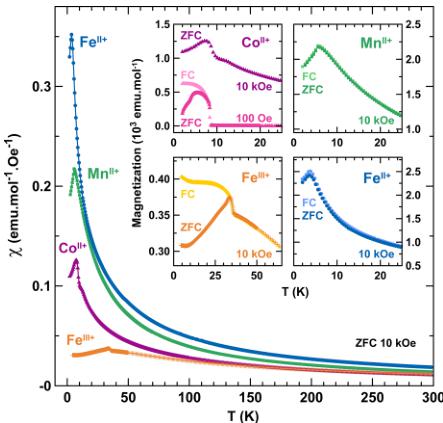 Figure 2. Temperature dependence of the magnetic susceptibility ( \( \chi \) ) of the title compounds, measured under zero-field-cooled (ZFC) conditions with a field of 10 kOe between 300 and 2 K. Purple triangles, green squares, orange crosses, and blue circles are assigned to \( \mathrm{Li}_{2}\mathrm{Co}^{\mathrm{II}}(\mathrm{SO}_{4})_{2} \) , \( \mathrm{Li}_{2}\mathrm{Mn}^{\mathrm{II}}(\mathrm{SO}_{4})_{2} \) , \( \mathrm{Li}_{1}\mathrm{Fe}^{\mathrm{II}}(\mathrm{SO}_{4})_{2} \) and \( \mathrm{Li}_{2}\mathrm{Fe}^{\mathrm{II}}(\mathrm{SO}_{4})_{2} \) respectively. Insets show enlargement of the ZFC (dark colors) and field-cooled (FC) (light colors) magnetization curves at low temperatures. For \( \mathrm{Li}_{2}\mathrm{Co}^{\mathrm{II}}(\mathrm{BO}_{4})_{2} \) only the 10-kOe ZFC curve is shown (purple triangles) and compared to the ZFC (dark pink) and FC (light pink) curves measured with a field of 100 Oe.