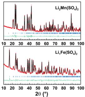 Later, we were able to synthesize a manganese equivalent \( \mathrm{Li_{2}Mn(SO_{4})_{2}} \) using the same procedure as the one previously described for the cobalt analogue. The high similarity of their two XRD patterns suggested that this new lithium manganese sulfate crystallizes in the same structure as the iron and cobalt compounds. This was confirmed with a Rietveld refinement of