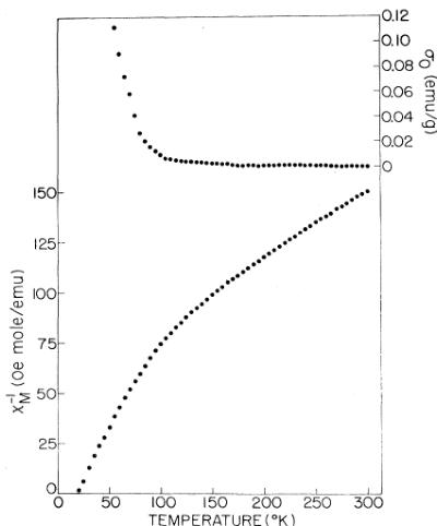 The magnetization-vs-field curves for \( NpMn_{2} \) are linear from 2.5 to 13.5 kOe in the temperature range 100–300 K. Below 100 K, the plots are curved, and they were treated in terms of Eq. (3) to correct for the effect of \( \sigma_{0} \) and to determine \( \chi_{0}^{1} \) . The reciprocal molar susceptibility is plotted against temperature in Fig. 10. The data are quite sharply curved over the range from 50 to 300 K. The change in sign of the curvature below 50 K is similar to that observed in \( NpNi_{2} \) and is presumably associated with the critical phenomena present just above \( T_{C} \) . The value of \( \sigma_{0} \) is essentially zero between 300 and 175 K and increases below this temperature, with a more rapid decrease below 100 K. The maximum value of \( \sigma_{0} \) attained near \( T_{C} \) is 0.35 emu/g.