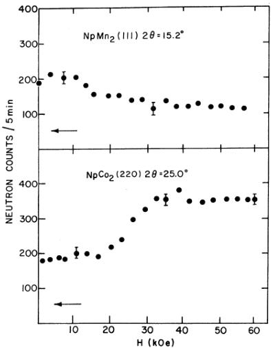 FIG. 12. Field dependence of the intensity of the (111) reflection from \( NpMn_{2} \) (top) and the (220) reflection from \( NpCo_{2} \) (bottom), both at 5 K. The horizontal arrows indicate the background level.