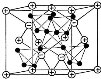 FIG. 14. Laves-phase structure of the present neptunium compounds. The open circles represent actinide atoms, the closed circles the transition-metal atom. The proposed antiferromagnetic structure of \( NpCo_{2} \) is designated by + and - signs at the Np site. The spin direction is undetermined.