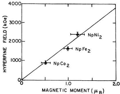 Strong supporting evidence for an interpretation in terms of localized 5f electrons is deduced from a consideration of the magnetic anisotropy as well as from a plot of \( \mu_{Np} \) as obtained from neutron diffraction versus the magnetic hyperfine field \( H_{hf} \) . Figure 15 shows a good linear relationship between these two quantities. Because of experimental uncertainties in both the neutron and NGR experiments on \( NpMn_{2} \) , the point for this compound is not included in Fig. 15, although the linear relationship apparently also holds. The solid line is that obtained in our earlier study of the neptunium monopnictides, \( ^{25} \) By analogy with the rare-earth Laves phases, \( ^{24} \) we should expect the iron compound to lie on the right of this straight line. This is because any hyperfine field transferred from the iron site will oppose the central field at the neptunium site. Although the error bars are quite large in Fig. 15, the hyperfine field at the neptunium site in \( NpFe_{2} \) does appear suppressed. However, the linearity is still striking and is the type of behavior associated with lanthanide systems.