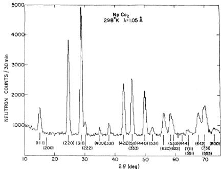 Because of the high Curie temperature of \( NpFe_{2} \) , the usual technique of obtaining neutron-diffraction patterns in the paramagnetic and ordered states would require a furnace for radioactive samples. Initially, we collected accurate integrated intensities as far as the (800) reflection \( \left[\sin\theta/\lambda=0.56\ \mathring{\mathrm{A}}^{-1}\right] \) and refined only the high-angle data \( \left[\sin\theta/\lambda>0.4\ \mathring{\mathrm{A}}^{-1}\right] \) , inasmuch as the magnetic scattering will be small for this angular range. The intensities at low angles were then calculated and subtracted from the observed intensities; the differences were assumed to arise from magnetic scattering. Because of the experimental uncertainties, this process was not quantitatively successful. However, the method did indicate magnetic moments on the Np and Fe atoms of \( \sim1.3\mu_{B} \) and \( \sim0.9\mu_{B} \) , respectively.