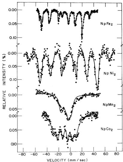The actinide cubic Laves phases form a fertile field for the study of magnetism. In intermetallic compounds, Hill \( ^{1} \) showed that critical actinide-actinide spacings exist beyond which magnetic order is found, and some of the actinide Laves phases fall in this region. Of the uranium Laves phases studied, only \( UFe_{2} \) orders ferromagnetically, although the magnetic moments reside almost entirely on the iron sites. \( ^{2} \) Some evidence suggests that \( UMn_{2} \) may undergo an antiferromagnetic transition. \( ^{3} \) In the plutonium Laves phases, nuclear- \( \gamma \) -ray-resonance (NGR or Mössbauer-effect) measurements have shown that \( PuFe_{2} \) is ferromagnetic at room temperature with a hyperfine field associated with the iron sites, and magnetization results \( ^{4} \) indicate that \( PuPt_{2} \) orders ferromagnetically at 6 K. Magnetic ordering is somewhat more widespread in the neptunium Laves phases. Previous NGR studies have shown that hyperfine fields occur at the iron sites in \( NpFe_{2} \) , \( ^{5,6} \) and at the neptunium sites in \( NpFe_{2} \) , \( NpCo_{2} \) , \( NpNi_{2} \) , \( NpIr_{2} \) , and \( NpAl_{2} \) . \( ^{7} \)
