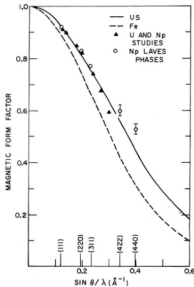 FIG. 6. Magnetic form factors for some actinide materials and metallic iron.