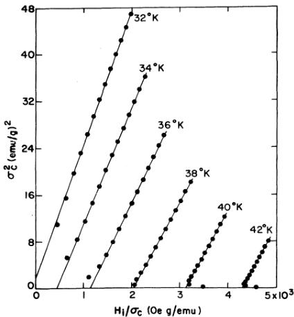 where \(\sigma_{0}\), \(A\), and \(B\) are adjustable parameters,\(^{8}\) Some plots of \(\sigma_{c}^{2}\) vs \(H_{i}/\sigma_{c}\), where \(\sigma_{c}=\sigma-\sigma_{0}\), near the transition temperature are shown in Fig. 8. The use of Eq. (3) to represent the data seems appropriate, and, on the basis of the temperature dependence of \(B\) (\(\approx\chi_{0}^{1}\)) and the curves in Fig. 8, we estimate a Curie temperature of \(T_{C}=32\pm1\) K for NpNi\(_{2}\). The uncertainty arises primarily from the rapid increase in \(\sigma_{0}\) as \(T_{C}\) is approached; a maximum value of \(\sigma_{0}=0.392\) emu/g at 32 K is obtained.