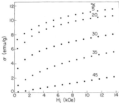 FIG. 9. Typical magnetization-vs-internal-field plots for \( NpNi_{2} \) between 5 and 45 K.