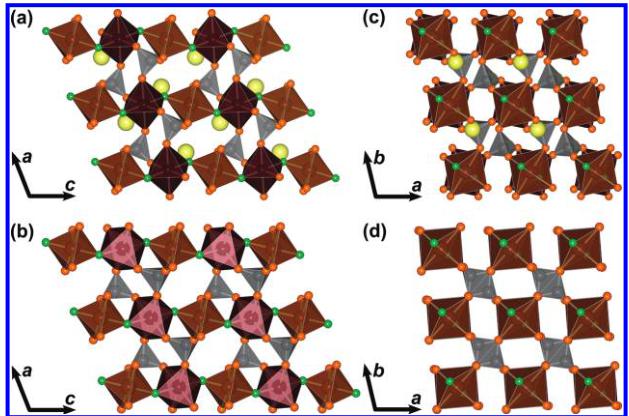 Figure 2. Illustration of the crystal structure of \( (a, c) \) LiFeSO \( _{4} \) F and \( (b, d) \) FeSO \( _{4} \) F. Fe site 1 and Fe site 2 are shown in red and brown, respectively. S is gray, O is orange, and F is green. The structure is composed of corner-sharing octahedra of two unique Fe sites which share corners through F atoms sitting trans with respect to each other along the length of the chains. Note that FeSO \( _{4} \) F is illustrated here in the P \( \overline{T} \) unit cell rather than C2/c in order to provide a more direct comparison with LiFeSO \( _{4} \) F.