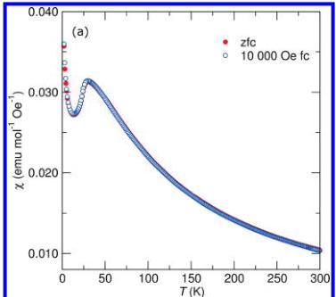 Magnetic Properties of \( LiFeSO_{4}F \) and \( FeSO_{4}F \) . The temperature dependence of the magnetic susceptibility for the title compounds is shown in panels a and b in Figure 3. In a field of 10 kOe, both compounds show cusps indicative of the onset of antiferromagnetic ordering at 100 and 25 K for \( FeSO_{4}F \) and \( LiFeSO_{4}F \) , respectively. Below 20 K, both samples show sharp upturns characteristic of a paramagnetic contribution which likely comes from imperfections in the crystal structure as has been found previously in other magnetic systems with reduced dimensionality. \( ^{14} \) It should also be noted that the zero-field-cooled (zfc) and field-cooled (fc) traces do not perfectly overlap in the region of 30–50K for the data collected from \( FeSO_{4}F \) . We attribute this feature to some partially lithiated phase (ie: \( Li_{x}FeSO_{4}F \) ) which is the result of an incomplete extraction of Li during the sample preparation.