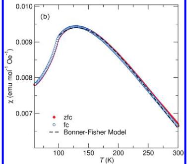 Figure 3. Temperature-dependent magnetic susceptibility of (a) \( LiFeSO_{4}F \) and (b) \( FeSO_{4}F \) . The transition temperature increases from 25 to 100 K with the removal of Li. Note that \( FeSO_{4}F \) demonstrates a much broader maximum reminiscent of systems with one-dimensional magnetic ordering and fits well to the Bonner–Fisher model of a classical chain of spins as denoted by the dashed line.