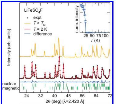 Neutron diffraction patterns were collected between 2 and 50 K for \( LiFeSO_{4}F \) and between 2 and 125 K for \( FeSO_{4}F \) on the high intensity powder neutron diffractometer D20 at the Institut Laue-Langevin, which is especially well adapted for magnetic structure determination, using a wavelength of 2.420 Å. Several extra peaks that correspond to the onset of long-range magnetic ordering evolve upon cooling below the respective ordering temperature as seen in Figure 4. The intensity of the strongest magnetic reflection for both phases is plotted as a function of temperature in the insets of Figure 4 with the observed ordering temperature, in good agreement with the temperature-dependent susceptibility data. We remark that the Néel temperature is much higher for \( FeSO_{4}F \) (100K) than for \( LiFeSO_{4}F \) (25K).