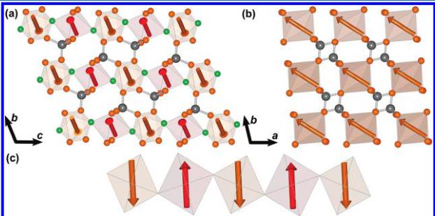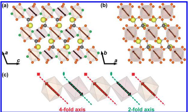 Figure 6. Illustration of the proposed magnetic structure for \( LiFeSO_{4}F \) . (a) perpendicular to the chains, (b) down the length of the chain, and (c) showing a single isolated chain. The magnetic moments along the length of the chains as well as between the chains align antiferromagnetically giving a G-type ground state. The propagation vector of the magnetic phase is \( \mathbf{k}=\left(\frac{1}{2},\frac{1}{2},0\right) \) . Note from (c) that the magnetic moments are oriented along pseudosymmetry axes (4-fold and 2-fold axis) of the \( FeO_{4}F_{2} \) octahedra, as a result of the anisotropy of \( Fe^{2+} \) .