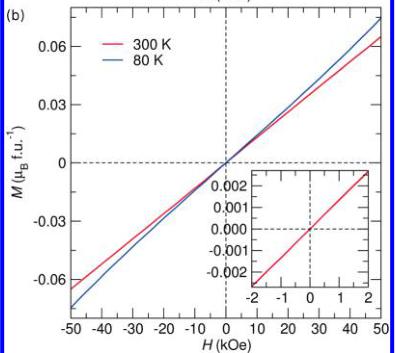 Figure 7. Isothermal magnetization curves for (a) \( LiFeSO_{4}F \) and (b) \( FeSO_{4}F \) obtained at various temperatures. The inset shows the low-field region of the 300 K curves demonstrating the presence of a small ferromagnetic impurity in the lithiated phase which is absent in the delithiated phase. Note that the impurity phase in the \( LiFeSO_{4}F \) was most likely washed out during the chemical oxidation, which was used to produce the \( FeSO_{4}F \) , and it is therefore not surprising that this impurity is absent in this phase.