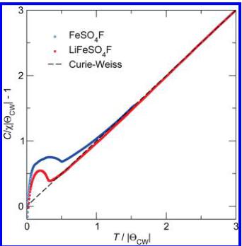 line through the origin (indicated by the dashed line) for a negative value of \( \Theta_{CW} \) . Plotting in this manner emphasizes deviations from purely Curie–Weiss behavior. It can be seen from this figure that while \( LiFeSO_{4}F \) demonstrates negative deviations from ideal Curie–Weiss behavior \( FeSO_{4}F \) has deviations that lay exclusively above the Curie–Weiss line. This negative deviation in the normalized susceptibility of \( LiFeSO_{4}F \) is traditionally interpreted as short-range correlations between spins, which is possible within the magnetic structure proposed if the two magnetic sublattices were to not precisely cancel. However, given that there is a very small amount of ferromagnetically ordered impurity, no clear conclusions can be drawn regarding this feature.