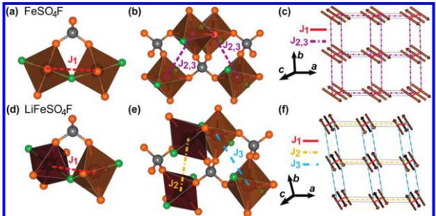 Figure 9. Illustration of the superexchange and supersuperexchange pathways considered in \( LiFeSO_{4}F \) and \( FeSO_{4}F \) . (a, d) \( J_{1} \) is the exchange pathway between neighboring irons within the chains mediated via an F atom or via a \( SO_{4} \) tetrahedron through a supersuperexchange pathway. (b, e) \( J_{2} \) and \( J_{3} \) connect iron atoms in adjacent chains, through a supersuperexchange pathway which is doubly degenerate with two distinct \( SO_{4} \) tetrahedra linking neighbors. In the case of the delithiated \( FeSO_{4}F \) compound, \( J_{2} \) and \( J_{3} \) are equivalent and are therefore labeled as \( J_{2,3} \) . (c, f) Illustration of the topology of the exchange pathways considered for \( FeSO_{4}F \) (c) and \( LiFeSO_{4}F \) (f). Note that from this topology it is clear that there is no geometrical frustration present.