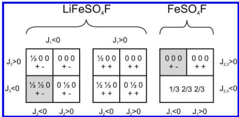 Figure 10. Magnetic phase diagrams for \( LiFeSO_{4}F \) and \( FeSO_{4}F \) . We consider three exchange integrals \( J_{1} \) , \( J_{2} \) , and \( J_{3} \) for the lithiated compound, and two exchange integrals \( J_{1} \) and \( J_{2,3} \) for the delithiated one, as \( J_{2} \) and \( J_{3} \) are geometrically equivalent because of the higher symmetry. For each domain, the different spin sequences and the corresponding propagation vector corresponding to the lowest energy (ground state) are indicated. The shaded regions correspond to the observed magnetic structure, as deduced by powder neutron diffraction.