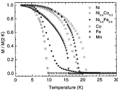 Ni Ni_{0.5}Co_{0.5} Ni_{0.5}Fe_{0.5} Co Fe Mn C (cm^{3} K/mol) 1.21(3) 2.02(6) 1.70(6) 2.85(8) 3.36(10) 4.42(14) \( \theta \) (K) 23(1) 10(3) 13(7) -2(6) -22(1) -25(1) T_{C} (K) 21 18 No LRO 9 19 16