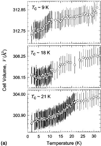 To further investigate the relative strength of the antiferromagnetic and ferromagnetic competing interactions, we synthesized the composition \( \left(\mathrm{Ni}_{0.5}\mathrm{Fe}_{0.5}\right)\left[\mathrm{N}(\mathrm{CN})_{2}\right]_{2} \) , whose parent compounds, \( \mathrm{Ni}\left[\mathrm{N}(\mathrm{CN})_{2}\right]_{2} \) and \( \mathrm{Fe}\left[\mathrm{N}(\mathrm{CN})_{2}\right]_{2} \) , are ferromagnetic and canted antiferromagnetic, respectively. The dc susceptibility of \( \left(\mathrm{Ni}_{0.5}\mathrm{Fe}_{0.6}\right)\left[\mathrm{N}(\mathrm{CN})_{2}\right]_{2} $ , shown in Fig. 1, displays a slower onset to a broader transition, over a range of 10 K, which finally reaches a maximum magnetization only below \( \sim5 \) K. While the Curie temperature of the \( \left(\mathrm{Ni}_{0.5}\mathrm{Co}_{0.5}\right)\left[\mathrm{N}(\mathrm{CN})_{2}\right)_{2} \) ferromagnet falls between those of the parent compounds, the transition temperature of \( \left(\mathrm{Ni}_{0.5}\mathrm{Fe}_{0,5}\right)\left[\mathrm{N}(\mathrm{CN})_{2}\right]_{2}\right. \) lies lower than those of the respective parent compounds. Further isothermal magnetization measurements, not shown in Fig. 1, indicate that while the 20 K data are typical of a paramagnet, below 15 K a small hysteresis is observed, reaching 1300 Oe at 2 K. Fits to the Curie-Weiss law give a Curie constant on the order of 1.70(6) cm \( ^{3} \) K/mol and a temperature-dependent Weiss constant of \( +13\pm7 \) K, depending on the temperature range of the fit. A summary of the magnetic data, including the Curie and Weiss constants from fitting to the Curie-Weiss law over the temperature range \( T_{C} Rietveld refinement of the data, taken on the D20 instrument, was carried out by employing (a) a two-phase model that accounts for both the nuclear and magnetic structures below \( T_{C} \) and (b) a single-phase model, describing only the nuclear structure for temperatures above \( T_{C} \) . The atomic position parameters were kept constant to the values deter- TABLE I. Bulk magnetic parameters determined from fits of the dc magnetization to the Curie-Weiss law, \(\chi=C/(T-\theta)\), over the temperature range \(T_{C} mined from long counting scans at 1.7(1) K using the D2b diffractometer. During these sequential refinements and in order to control the stability of the least-squares procedure, only the following parameters were refined in each cycle: scale factor, background (cosine Fourier series of six terms), lattice size, overall isotropic temperature factors, and magnetic moment (below \( T_{C} \) ). Neither the D20 measurements nor complementary measurements on the higher-resolution D2b diffractometer at 1.7 and 25 K showed deviation from the previously reported orthorhombic Pnnm space group. \( ^{5-11} \) Therefore, this work will concentrate on the temperature variation of the structural parameters as well as the additional magnetic scattering observed at low temperature for all but the \( \mathrm{Ni}_{0.5}\mathrm{Fe}_{0.5}[\mathrm{N}(\mathrm{CN})_{2}]_{2} \) composition. The Rietveld refinement of the high-resolution powder neutron diffraction data of \( \mathrm{Ni}_{0.5}\mathrm{Fe}_{0.5}N(\mathrm{CN})_{2}]_{2} \) collected at 1.65 K on diffractometer D2b is shown in Fig. 2 as an indication of the typical quality of the experimental data and fits. The relevant occupancy of the metal sites was refined as \( n_{\mathrm{Fe}} = 0.61(17) \) and \( n_{\mathrm{Ni}} = 0.39(17) \) . The resulting structural parameters for the compounds, \( \mathrm{Fe}^{II}[\mathrm{N}(\mathrm{CN})_{2}]_{2} \) , \( \mathrm{Ni}_{0.5}\mathrm{Fe}_{0.5} \mathrm{N}(\mathrm{CN})_{2}]_{2} \) , and \( \mathrm{Ni}_{0.5}\mathrm{Co}_{0.5}[\mathrm{N}(\mathrm{CN})_{2}]_{2} \) , not reported before, are compiled in Table II, together with those for \( \mathrm{Ni}^{II}[\mathrm{N}(\mathrm{CN})_{2}]_{2} \) , $ \mathrm{Co}^{II}[\mathrm{N}(\mathrm{CN})_{2}]_{2} MATH90 \mathrm{Mn}^{II}[\mathrm{N}(\mathrm{CN})_{2}]_{2} $ . Thermal expansion was investigated in three selected members of the \( M[N(CN)_{2}]_{2} \) series. Figure 3(a) shows the temperature dependence of the unit-cell volume of \( M[N(CN)_{2}]_{2} \) (M=Co, \( Ni_{0.5}Co_{0.5} \) , and Ni) and Fig. 3(b) the variation of the unit-cell parameters of \( \mathrm{Co}[N(CN)_{2}]_{2} \) with FIG. 2. Observed (points), calculated (line), and difference neutron powder diffraction profiles for the nuclear structure of \( Ni_{0.5}Fe_{0.5}[N(CN)_{2}]_{2} \) . The vertical lines mark the position of the Bragg reflections for the Pnnm space group. temperature. Expanded views, Fig. 3(a) and the inset to Fig. 3(b), show the subtle changes around the \( T_{C} \) . The refinements lead to the conclusion that above \( T_{C} \) , the monotonic increase in the average unit-cell volume with increasing temperature, observed in the series, results from a monotonic expansion along the a and b axes, coupled with a contraction along the c axis. A summary of the thermal expansion coefficients, \( \alpha_{I}=(l_{T_{2}}-l_{T_{1}})/[l_{T_{1}}(T_{2}-T_{1})] \) , where l is the length in consideration, T is the sample temperature, and \( T_{2}>T_{1} \) is given in Table III. Close inspection of the evolution of the lattice parameters around the magnetic ordering temperature reveals magnetostriction effects. These correlate with the spontaneous changes in the magnetic properties and correspond to the force exerted on the lattice at the magnetic transition. They can be characterized by the magnetostriction constant, \( \lambda_{s}=\Delta L/L_{0} \) , where \( \Delta L \) is the difference between the lengths in the magnetized \( L_{m} \) and the nonmagnetized \( L_{0} \) state. In the present case, the zero-field linear striction in the \( \mathrm{Co}[\mathrm{N}(\mathrm{CN})_{2}]_{2} \) ferromagnet is more noticeable for the a axis. As the temperature decreases from \( T_{C} \) to 6.5 K, the a axis contracts by 0.0005(2) Å. The “step-like” changes in
